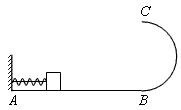 3、计算题 一段细绳把物体与墙面连接,物体与墙面之间有一个被压缩的弹簧,弹簧具有3.2J的弹性势能。已知水平段AB光滑,半圆段BC不光滑,其半径R=0.4m,物体质量m=0.1kg,g=10m/s2。若将细绳剪断,物体刚好可以到达最高点C。