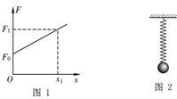 5、选择题  某同学在实验室中找到一根拉力弹簧,经测量发现其弹力F与弹簧伸长量x的关系如图1所示(图中F0、F1、x1已知)。现将这根弹簧上端固定,下端接一质量为m的小球,待小球静止后,将小球向下拉一小段距离(在弹簧的弹性限度内),此时弹簧的伸长量为x2,然后由静止释放小球,小球在竖直方向振动。弹簧质量可忽略不计,重力加速度为g。当小球速度达到最大时弹簧的伸长量为