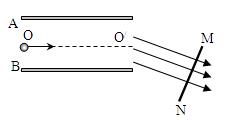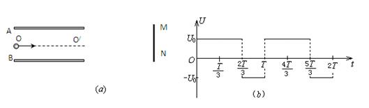 1、计算题 如图(a),平行金属板A和B间的距离为d ,它们的右端安放着靶MN(可金属板右侧上下移动也可在纸面内转动),现在A、B板上加上如图(b)所示的方波形电压,t=0时A板比B板的电势高,电压的正向值为U0,反向值也为U0.现有由质量为m的带正电且电荷量为q的粒子组成的粒子束,从AB的中点O以平行于金属板方向OO/的速度大小为