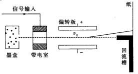 5、计算题 喷墨打印机的结构简图如图所示,其中墨盒可以发出墨汁微滴,其半径约为10-5 m,此微滴经过带电室时被带上负电,带电的多少由计算机按字体笔画高低位置输入信号加以控制,带电后的微滴以一定的初速度进入偏转电场,带电微滴经过偏转电场发生偏转后,打到纸上,显示出字体,无信号输入时,墨汁微滴不带电,径直通过偏转板而注入回流槽流回墨盒。