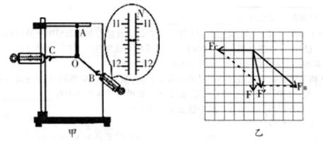 5、实验题 (8分)验证“力的平行四边形法则”实验如图所示,A为固定橡皮的图钉,O为橡皮筋与细绳的结点,OB、OC为细绳子,图乙是在白纸上根据实验结果画出的图。图甲中弹簧秤B的读数为 N;图乙中的F和