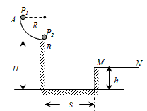 1、计算题 如图所示,凹槽的水平底面宽度s=0.3m,左侧高度H=0.45m,右侧高度h=0.25m。凹槽的左侧竖直面与半径R=0.2m的1/4光滑圆弧轨道相接,A和B分别是圆弧的端点,右侧竖直面与水平面MN相接。小球P1静止从A点沿圆弧轨道滑下,与静置于B点的小球P2发生弹性碰撞。P2的质量m=1kg,P1的质量是P2质量的k倍。已知重力加速度g=10m/s2,不计空气阻力。