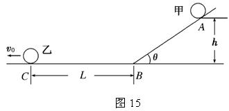 1、计算题 (12分)如图15所示,小球甲从倾角θ=30°的光滑斜面上高h=5 cm的A点由静止释放,同时小球乙自C点以速度v0沿光滑水平面向左匀速运动,C点与斜面底端B处的距离L=0.4 m.甲滑下后能沿斜面底部的光滑小圆弧平稳地朝乙追去,甲释放后经过t=1 s刚好追上乙,求乙的速度v0.