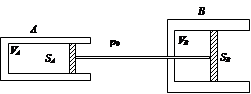 5、计算题  如图所示,在固定的气缸A和B中分别用活塞封闭一定质量的理想气体,活塞面积之比为SA:SB =? 1:2.两活塞以穿过B的底部的刚性细杆相连,可沿水平方向无摩擦滑动.两个气缸都不漏气.初始时,A、B中气体的体积皆为V0,温度皆为T0=300K.A中气体压强pA=1.5p0,p0是气缸外的大气压强.现对A加热,使其中气体的压强升到 ,同时保持B中气体的温度不变.求此时A中气体温度TA .