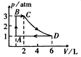 2、计算题 如图所示,一定质量的理想气体从状态A经B、C、D再回到A,问AB、BC、CD、DA是什么过程?已知在状态A时容积为1L,求该气体在B、C、D三种状态时的体积?并把此图改画为p-V图。