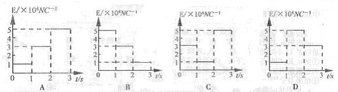 1、选择题 如右图所示,固定光滑的绝缘斜面倾角为30°,其上方空间有平行于斜面的匀强电场E,将质量为m=0.8kg,电荷量为+10-4C的物体(可视为质上噗)放在斜面上,场强E的大小变化如下图所示,将物质由静止释放,则在3s内物体位移最大的是?(?)