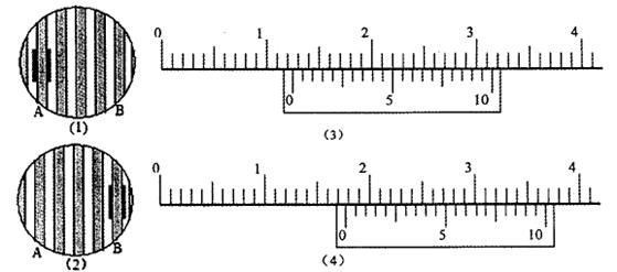1、实验题 某同学在做“双缝干涉测定光的波长“实验时,第一次分划板中心刻线对齐第2条亮纹的中心时(如图1中的A),游标卡尺的示数如图3所示,第二次分划板中心刻线对齐第6条亮纹时(如图2中的B),游标卡尺的示数如图4所示。已知双缝间距d=0.5 mm,双缝到屏的距离L="1" m。则: