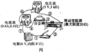 (2)测量该合金棒电阻的实物电路如图丙所示(相关器材的参数已在图中标出)。该合金棒的电阻约为几个欧姆,图中有一处连接不当的导线是______________;(用标注在导线旁的数字表示)