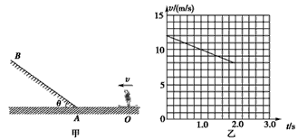 3、计算题 滑板运动是一项陆地上的“冲浪运动”,如图甲所示,OAB是同一竖直平面上的滑行轨道,其中OA段是长27m的水平轨道,AB段是倾角θ=37°足够长的斜直轨道,OA与AB在A点平滑连接。已知滑板及运动员总质量为60kg,运动员从水平轨道向左滑向斜直轨道,滑到O点开始计时,其后一段时间内的运动图象如图乙所示。将滑板及运动员视为质点,滑过拐角时速度大小不变,在水平和斜直轨道上滑板和接触面间的动摩擦因数相同。(取g=10m/s2,sin37°=0.6,cos37°=0.8,忽略空气阻力)求: