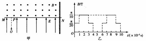=106 C/kg的正电荷从电场中的O点由静止释放,经过t0=1×10-5s后,通过MN上的P点进入其上方的匀强磁场。磁场方向垂直于纸面向外,以电荷第一次通过MN时开始计时,磁感应强度按图乙所示规律周期性变化。