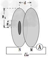 4、计算题 如图所示,一对半径均为R1的金属板M、N圆心正对平行放置,两板距离为d,N板中心镀有一层半径为R2的圆形锌金属薄膜,d<<R2<R1,两板之间电压为UMN,两板之间真空且可视为匀强电场。N板受到某种单色光照射后锌金属薄膜表面会发射出最大速率为v,方向各异的电子,已知电子的电荷量为e,质量为m,每秒稳定发射n个电子。电子在板间运动过程中无碰撞且不计电子的重力和电子间相互作用,电子到达M板全部被吸收。M板右侧串联的电流表可以测量到通过M板的电流I。试求: