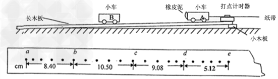 2、实验题 如图为用打点计时器探究碰撞中的不变量的实验:在小车A的前端粘有橡皮泥,推动小车A使之做匀速直线运动,小车A与原来静止在前方的小车B相碰并粘在一起继续做匀速直线运动,在小车A后连着纸带,电磁打电计时器电源频率为50Hz。