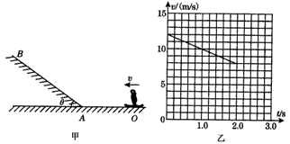 4、计算题 滑板运动是一项陆地上的“冲浪运动”,如图甲所示,OAB是同一竖直平面上的滑行轨道,其中OA段是长27 m的水平轨道,AB段是倾角θ=37°、足够长的斜直轨道,OA与AB在A点平滑连接。已知滑板及运动员的总质量为60 kg,运动员从水平轨道向左滑向斜直轨道,滑到O点开始计时,其后一段时间内的运动图象如图乙所示。将滑板及运动员视为质点,滑过拐角时速度大小不变,在水平和斜直轨道上滑板和接触面间的动摩擦因数相同。(g取10 m/s2,sin37°=0.6,cos37°=0.8,忽略空气阻力)求: