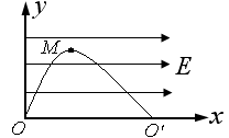 4、计算题 (6分)如图所示,在水平方向的匀强电场中,有一带电体自O点竖直向上射出,它的初动能为4J.当它上升到最高点M时,它的动能为5J,则物体折回通过与O点在同一水平线上的O’点时,其动能为多少?