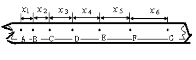 1、填空题 在做“研究匀变速直线运动”的实验时,得到一条纸带如图所示,A、B、C、D、E、F、G为计数点,每两个计数点间还有4个点未画出,x1 ="1.20cm," x 2 ="1.60cm," x 3 ="1.98cm," x 4 =2.38cm, x 5 =2.79cm, x 6 =3.18cm