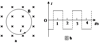 5、选择题 如图a所示,变化的磁场中放置一固定的导体圆形闭合线圈,图a中所示的磁感应强度和电流的方向为设定的正方向,已知线圈中感应电流i随时间t变化的图象如图b所示。则在图c中可能是磁感应强度B随时间t变化的图象是