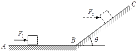 2、简答题 如图所示,质量m =1.6kg的滑块原来处于水平面AB上,在大小为F1=8.0N的水平推力作用下向右匀速运动,接着进入倾角θ=37°的斜面BC运动.