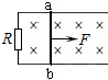 1、填空题 如图所示,水平面上有一对平行光滑金属导轨,导轨左端串有一电阻R,金属杆ab垂直平放在两导轨上,整个装置处于竖直向下的匀强磁场中,忽略导轨的电阻,但ab杆的质量和电阻都不能忽略.现给ab杆施以水平向右的恒力F,在ab杆从静止开始向右运动过程中,外力F做的功______(选填:“大于”、“等于”或“小于”)整个电路消耗的电功,磁场对ab杆作用力的功率______(选填:“大于”、“等于”或“小于”)电阻R上消耗的电功率.
