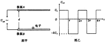 1、计算题 制备纳米薄膜装置的工作电极可简化为真空中间距为d的两平行极板,如图甲所示,加在极板A、B间的电压UAB作周期性变化,其正向电压为U0,反向电压为-kU0(k>l),电压变化的周期为2T,如图乙所示,在t=0时,极板B附近的一个电子,质量为m、电荷量为e,受电场作用由静止开始运动若整个运动过程中,电子未碰到极板A,且不考虑重力作用。
