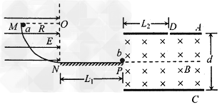 4、计算题 如图所示,MN是竖直平面内的1/4圆弧轨道,绝缘光滑,半径R=1m。轨道区域存在E=4N/C、方向水平向右的匀强电场。长L1=5 m的绝缘粗糖水平轨道NP与圆弧轨道相切于N点。质量ma=100g、电荷量qa=+1C的金属小球a从M点由静止开始沿圆弧轨道下滑,进入NP轨道随线运动,与放在随右端的金属小球b发生正碰,b与a等大,不带电,mb=50g,b与a碰后均分电荷量,然后都沿水平放置的A、C板间的中线进入两板之间。已知小球a恰能从C板的右端飞出,速度为
