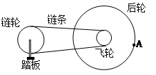 1、选择题 右图为某种自行车的链轮、链条、飞轮、踏板、后轮示意图,在骑行过程中,踏板和链轮同轴转动、飞轮和后轮同轴转动,已知链轮与飞轮的半径之比为3:1,后轮直径为660 mm,当脚踩踏板做匀速圆周运动的角速度为5 rad/s时,后轮边缘处A点的线速度和向心加速度为(?)
