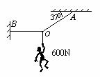 1、计算题 如图10所示,一位重600N的演员,悬挂在绳上.若AO绳与水平方向的夹角为37°,BO绳水平,则AO、BO两绳受到的力各为多大?若保持O点位置不变,将B点缓慢向上移,则AO、BO的拉力如何变化?(sin370=0.6,cos370=0.8)