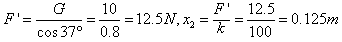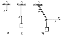 (2)再用一细线拴在图乙中的A处,然后用一水平的力F向右拉动,使橡皮筋与竖直方向成37°角,并保持静止,如图丙所示,求所加外力F的值和橡皮筋的伸长量x2。(sin37°=0.6,cos37°=0.8)
