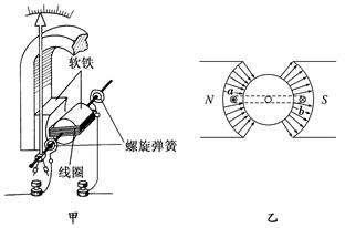 3、选择题 实验室经常使用的电流表是磁电式仪表.这种电流表的构造如图甲所示.蹄形磁铁和铁芯间的磁场是均匀地辐向分布的.当线圈通以如图乙所示的电流,下列说法正确的是( )
