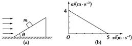 5、计算题  (10分)如图 (a),质量m=1 kg的物体沿倾角θ=37°的固定粗糙斜面由静止开始向下运动,风对物体的作用力沿水平方向向右,其大小与风速v成正比,比例系数用k表示,物体加速度a与风速v的关系如图 (b)所示,(sin 37°=0.6,cos 37°=0.8,g=10 m/s2),求: