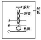 3、选择题 一个研究性学习小组设计了一个竖直加速度器,如下图所示.把轻弹簧上端用胶带固定在一块纸板上,让其自然下垂,在弹簧末端处的纸板上刻上水平线A.现把垫圈用胶带固定在弹簧的下端,在垫圈自由垂下处刻上水平线B,在B的下方刻一水平线C,使AB间距等于BC间距.假定当地重力加速度g=10 m/s2,当加速度器在竖直方向运动时,若弹簧末端的垫圈 (? )