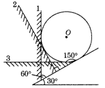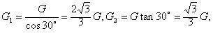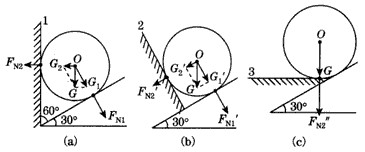 3、计算题 如图所示,重为G的光滑球在倾斜角为30°的斜面 上,当被与斜面夹角为60°、90°、150°的挡板挡住于1、2、3的位置时,斜面与挡板所受的压力分别为多大?