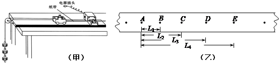 ②如图(乙)所示是某次实验中得到的一条纸带,其中A、B、C、D、E是计数点(每打5个点取一个计数点),其中L1="3.07cm," L2="12.38cm," L3="27.87cm," L4=49.62cm。则打C点时小车的速度为______m/s,小车的加速度是_______m/s2。(计算结果均保留三位有效数字)