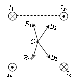 本题解析:根据右手定则可确定每根电流在O点的磁场方向,I1、I3的磁场方向在I2、I4的连线上,由于I1>I3所以合磁场方向沿连线向左下,同理可判断I2、I4的合磁场方向沿I1、I3连线向下,根据平行四边形定则再次合成可确定,0处磁感应强度的方向可能为B4
