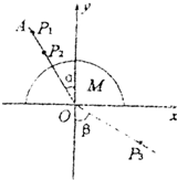 1、填空题 如图所示,画有直角坐标系xOy的白纸位于水平桌面上,M是放在白纸上的半圆玻璃砖,其底面的圆心在坐标系原点,直边与x轴重合,OA是画在纸上的直线,P1、P2为竖直的插在直线OA上的两枚大头针,P3是竖直插在纸上的第三枚大头针,α是直线OA与y轴正方向的夹角,β是直线OP3与y轴负方向的夹角,只要直线OA画得合适,且P3的位置取得正确,测得角α、β便可求得玻璃的折射率.某学生在用上述方法测量玻璃的折射率时,在他画出的直线OA上竖直插上了P1、P2两枚大头针,但在y<0的区域内,不管眼睛放在何处,都无法透过玻璃看到P1、P2的像,他应采取的措施是______.若他已正确地测得了α、β的值,则玻璃的折射率n=______.