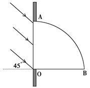 ,一束平行光以45°入射角射入玻璃砖的OA面,这些光线中只有一部分能从圆柱的AB面上射出,假设凡射到OB面的光线全部被吸收,也不考虑OA面的 反射作用,试问圆柱AB面上能射出光线部分占AB表面的几分之几?