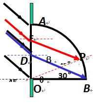 D点以下的光线射到OB面上被吸收. 设射到E点的光线折射到P点刚好全反射E点以上的光线射到圆弧面被全反射?不难求出 θ="15" °,所以弧PB=