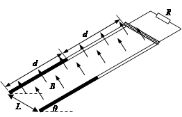 4、计算题 (16分)如图所示,在匀强磁场中有一倾斜的平行金属导轨,导轨间距为L=0.2m,长为2d,d=0.5m,上半段d导轨光滑,下半段d导轨的动摩擦因素为μ=