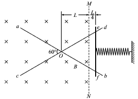 1、计算题 如图所示,“×”型光滑金属导轨abcd固定在绝缘水平面上,ab和cd足够长,∠aOc=60°。虚线MN与∠bOd的平分线垂直,O点到MN的距离为L。MN左侧是磁感应强度大小为B、方向竖直向下的匀强磁场。一轻弹簧右端固定,其轴线与∠bOd的平分线重合,自然伸长时左端恰在O点。一质量为m的导体棒ef平行于MN置于导轨上,导体棒与导轨接触良好。某时刻使导体棒从MN的右侧L/4处由静止开始释放,导体在被压缩弹簧的作用下向左运动,当导体棒运动到O点时弹簧与导体棒分离。导体棒由MN运动到O点的过程中做匀速直线运动。导体棒始终与MN平行。已知导体棒与弹簧彼此绝缘,导体棒和导轨单位长度的电阻均为r0,弹簧被压缩后所获得的弹性势能可用公式