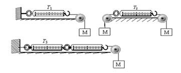 1、选择题 在下图所示的三种情况中,砝码的质量均为M,不计一切摩擦和弹簧秤的重力,则三个弹簧秤的示数T1、T2、T3的关系是( )