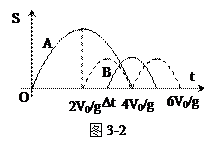 本题解析:如按通常情况,可依据题意用运动学知识列方程求解,这是比较麻烦的.如换换思路,依据s=V0t-gt2/2作s-t图象,则可使解题过程大大简化.如图3-2所示,显然,两条图线的相交点表示A、B相遇时刻,纵坐标对应位移SA=SB.由图3-2可直接看出Δt满足关系式时, B可在空中相遇.