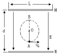 2、计算题  如图水平固定放置的平行金属板M、N,两板间距为d。在两板的中心(即到上、下板距离相等,到板左、右端距离相等)有一悬点O系有一长r=d/4的绝缘细线,线的另一端系有一质量为m、带正电荷的小球,电荷量为q。两板间有一竖直向下的匀强电场,匀强电场大小E=3mg/q。小球在最低点A处于静止。求: