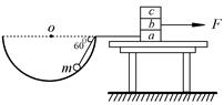 4、选择题 如图所示,水平桌面上有三个相同的物体a、b、c叠放在一起, a的左端通过一根轻绳与质量为m = 3kg的小球相连,绳与水平方向的夹角为60°,小球静止在光滑的半圆形器皿中.水平向右的力F = 40N作用在b上,三个物体保持静止状态. g取10m/s2,下列说法正确的是