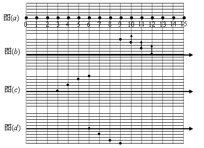 1、计算题 如图(a),表示一条均匀细绳,0、1、2、3、……表示绳上的一系列等间隔的质点,由0到15点的长度为180cm。一列简谐横波沿此绳传播,在t=0时刻,绳上9~12点的位置及运动方向如图(b)所示;t=14s时刻,绳上3~6各点的位置如图 (c)所示;t=20s时刻,绳上6~9各点的位置如图(d)所示。试确定:
