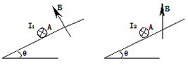 2、选择题 在同一光滑斜面上放同一导体绑棒,右图所示是两种情况的剖面图。它们所外空间有磁感强度大小相等的匀强磁场,但方向不同,一次垂直斜面向上,另一次竖直向上,两次导体A分别通有电流I1和I2,都处于静止平衡。已知斜面的倾角为θ,则:(?)