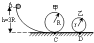 1、计算题 如图所示半径为R、r(R>r)甲、乙两圆形轨道安置在同一竖直平面内,两轨道之间由一条水平轨道(CD)相连,如小球从离地3R的高处A点由静止释放,可以滑过甲轨道,经过CD段又滑上乙轨道后离开两圆形轨道,小球与CD段间的动摩擦因数为μ,其余各段均光滑。
