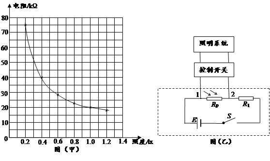 本题解析:(1)通过描点连线,可知阻值随光照强度的增大非线性减小(2)根据题目所给条件,设计电路中,光敏电阻与R1为串联关系,由于电源电动势为3V,当光敏电阻两端电压为2V时,串联电阻电压为1V,当照度为1.0x时,光敏电阻为20kΩ,所以串联电阻阻值为10kΩ,选择R1