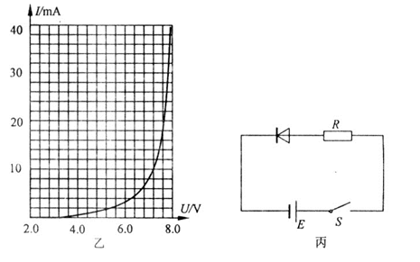 2、实验题 二极管是电子线路中常用的电子元器件.它的电路符号如图(甲)所示,正常使用时,“+”极一端接高电势,“—”极一端接低电势.要描绘某二极管在0~8V间的伏安特性曲线,另提供有下列的实验器材:电源E(电动势为8V,内阻不计):压档v有五个量程,分别为2.5V、10V、50V、250V、500V,可视为理想电压表);开关一只;导线若干。
