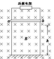 1、计算题 (12分)如图所示,宽度为L的金属框架竖直固定在绝缘地面上,框架的上端接有一个压敏电阻元件,其阻值与其两端所加电压成正比,即R=kU,式中k为已知的常数.框架上有一质量为m,离地高为h的金属棒,金属棒与框架始终接触良好无摩擦,且保持水平,磁感应强度为B的匀强磁场,方向垂直于框架平面向里.今将金属棒由静止释放,棒沿框架向下运动,不计金属棒电阻,重力加速度为g.试求: