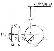 5、计算题 如图所示,垂直纸面的两平行金属板M、N之间加有电压,M板上O1处有一粒子源,可不断产生初速度为零的带正电粒子,粒子电荷量为q,质量为m,N板右侧是一半径为R的接地金属圆筒,圆筒垂直于纸面且可绕中心轴逆时针转动。O2为N板上正对O1的小孔,O3、O4为圆筒某一直径两端的小孔,开始时O1、O2、O3、O4在同一水平线上。在圆简上方垂直纸面放置一荧光屏,荧光屏与直线O1O2平行,圆筒转轴到荧光屏的距离OP=3R。不计粒子重力及粒子间相互作用。