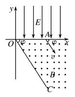 3、计算题 如图所示,在xOy平面的第一象限有一匀强电场,电场的方向平行于y轴向下;在x轴和第四象限的射线OC之间有一匀强磁场,磁感应强度的大小为B,方向垂直于纸面向外.有一质量为m,带有电荷量+q的质点由电场左侧平行于x轴射入电场.质点到达x轴上A点时,速度方向与x轴的夹角为φ,A点与原点O的距离为d.接着,质点进入磁场,并垂直于OC飞离磁场.不计重力影响.若OC与x轴的夹角也为φ,求